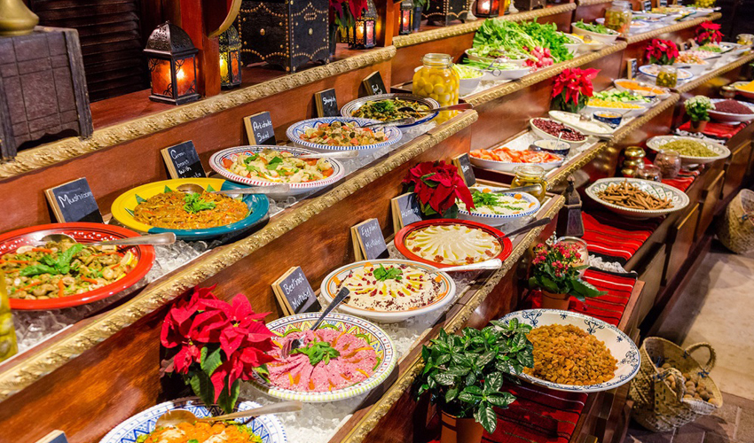 - COZINHA: buffet Árabe, incluindo estações de cozinha ao vivo, pratos tradicionais dos Emirados, saladas frescas e Mezze quente e frio.